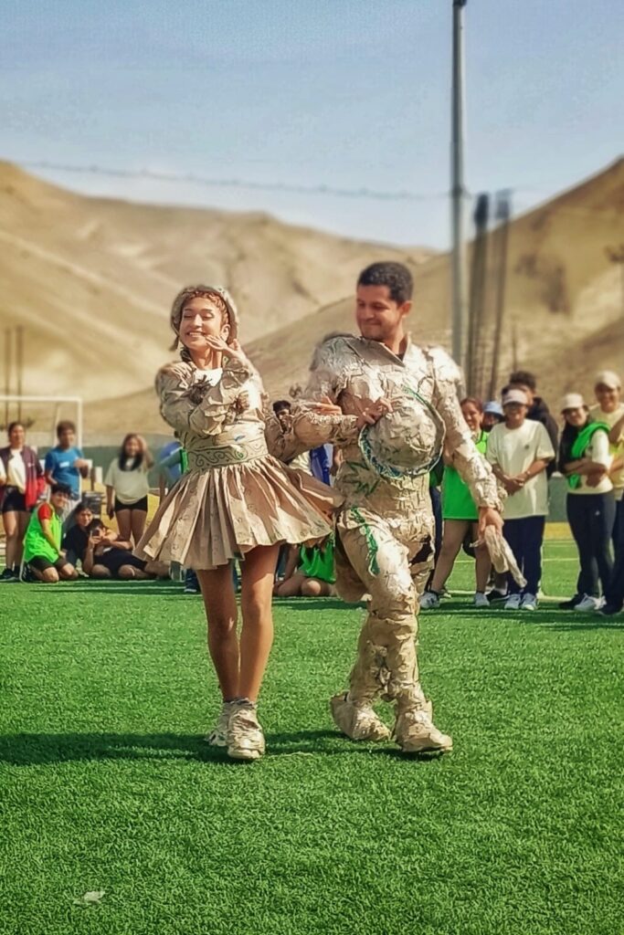 Los participantes fueron organizados en cuatro equipos de colores —verde, amarillo, melón y morado—, integrando a representantes de las cuatro universidades en cada grupo. La jornada comenzó con un torneo de vóley mixto, continuó con juegos recreativos como jalar la cuerda, y más tarde los equipos demostraron su talento e imaginación en un divertido desafío de creación de trajes típicos con materiales reciclados.